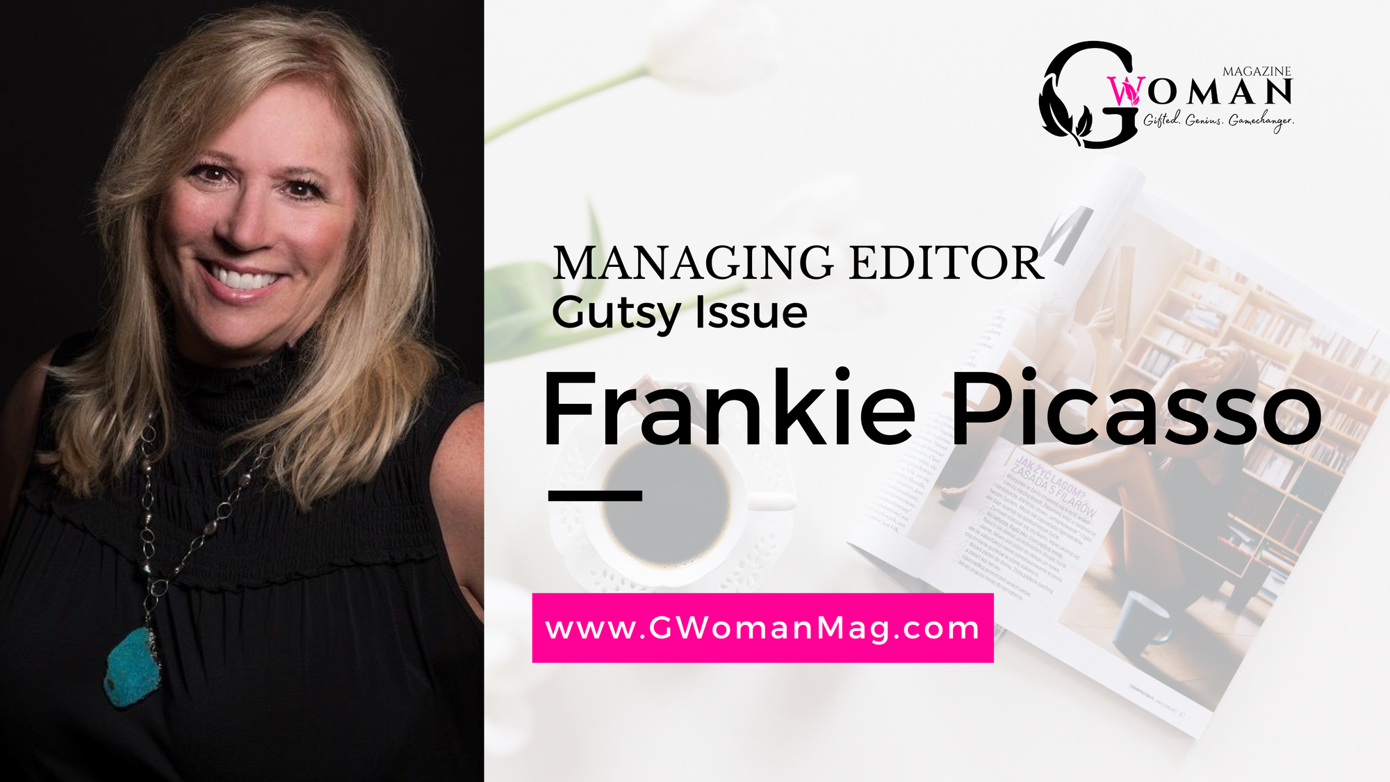 Frankie Picasso is the Managing Editor (Gutsy Issue). She is a talk show host, author, artist, socialpreneur, master coach and champion for change, transforming lives and influencing culture for the past 40 years. She co-hosts The G-Spot on G-Woman Radio. Learn more about her at www. FrankiePicasso.com.