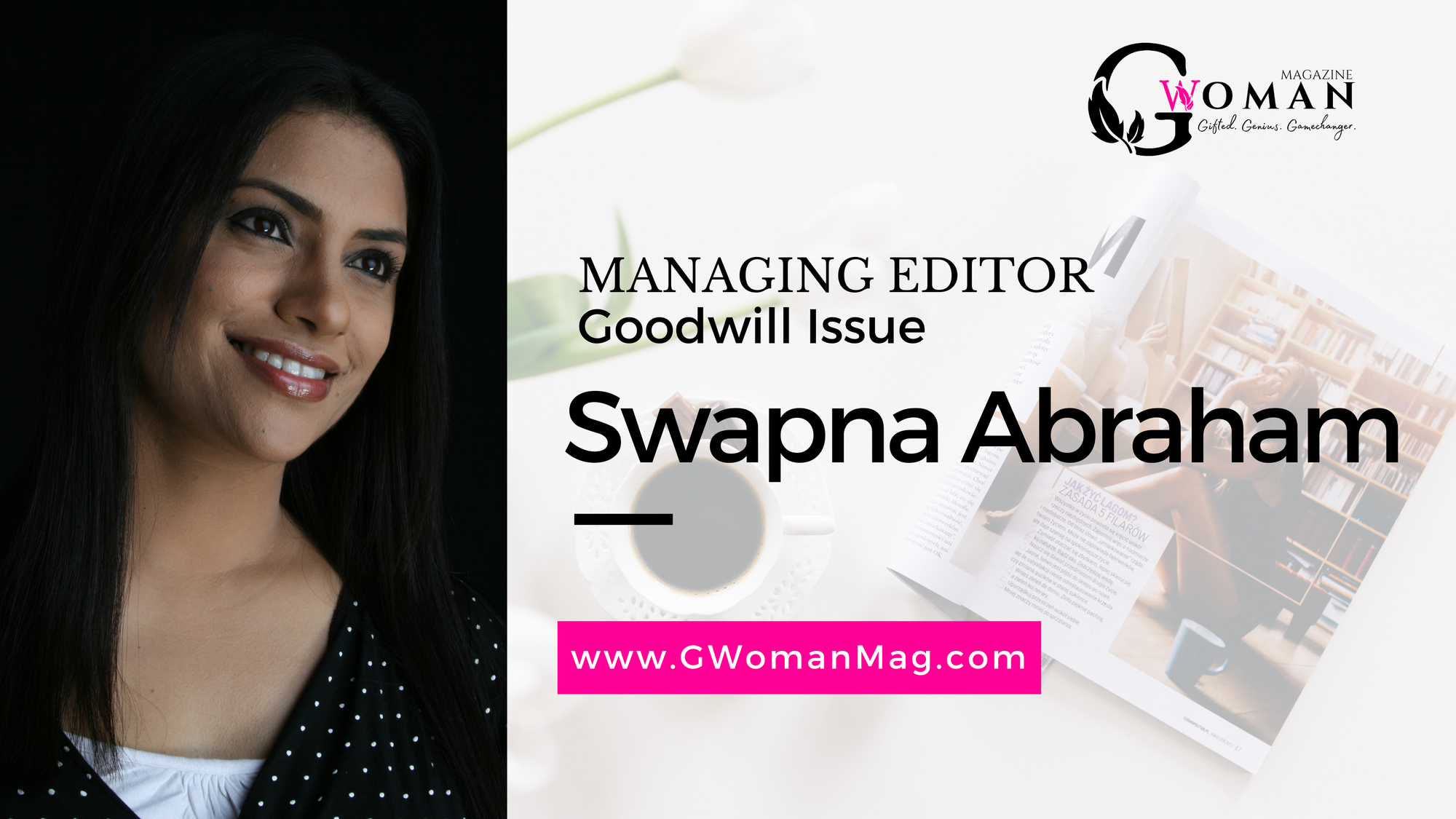 Swapna Abraham is the Managing Editor (Goodwill Issue). She is a multiple world record holder in music and singer-songwriter, actor, author, interior designer, mentor, and branding enthusiast. She co-hosts "The G-Spot" on G-Woman Radio. Learn more about her at www.SwapnaAbraham.com
